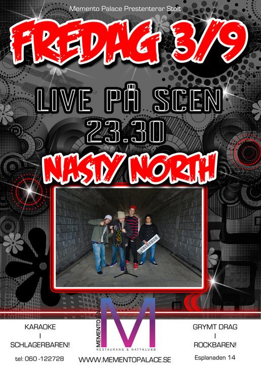 Warrup? Ny uppdatering people och ni kommer digga detta! Nasty North blivit bokad på nattklubben Memento Palace 3/9. Det som gäller är då 70:- inträde, 18+ och ta med dina vänner och ha en grym kväll.